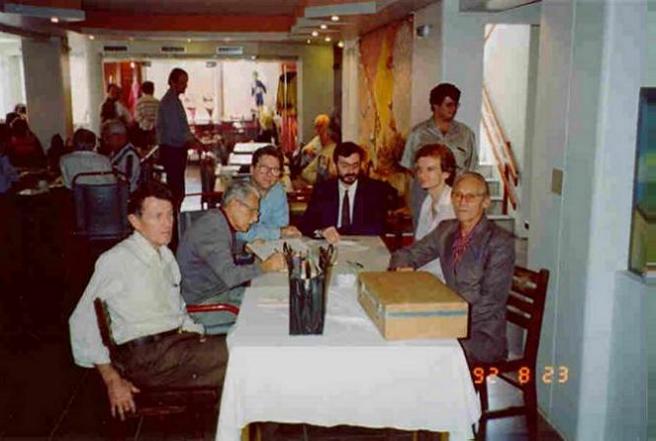 Na mesa (em 1º plano) da esquerda para a direita: Arno Martin, Bruno Carlos Eberhardt, ?, Luís Cláudio Fritzen, Roberto João Eissler e Curt Donner. Logo atrás, de pé, Luiz Antônio de Oliveira Horn.
