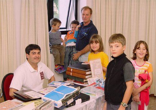 Leonardo (Curitiba) atendendo um visitante e a criançada.