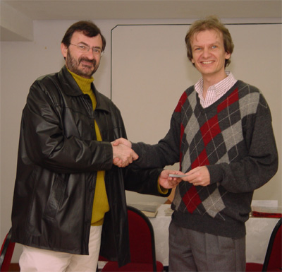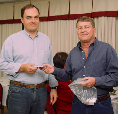 Denis, recebendo, das mãos de Ernani, brinde ofertado pela Brasil Telecom.